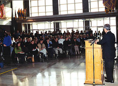 U.S Ambassador to Canada Paul Cellucci addresses volunteers in the main lobby of the Confederation Building. (November 13, 2001)