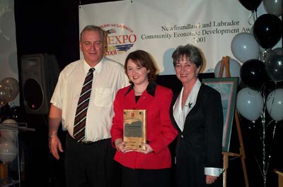 Michelle Snow (centre) accepts award for Excellence in Youth Leadership, one of the province's first Community Economic Development Awards, presented Friday night during RuralEXPO 2001. With her are Industry, Trade and Rural Development Minister Beaton Tulk (left), who announced the award winners and Youth Services and Post Secondary Education Minister Sandra Kelly, who presented the award to Ms. Snow. (October 26, 2001) |
