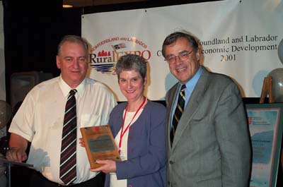 Industry, Trade and Rural Development Minister Beaton Tulk ; Bea Courtney, Newfoundland and Labrador Organization of Women Entrepreneurs (NLOWE); and Government Services and Lands Minister Walter Noel, following the presentation of the Excellence in Fostering Entrepreneurship Award to NLOWE at the province's first Community Economic Development Awards, presented Friday night during RuralEXPO 2001. (October 26, 2001) |
