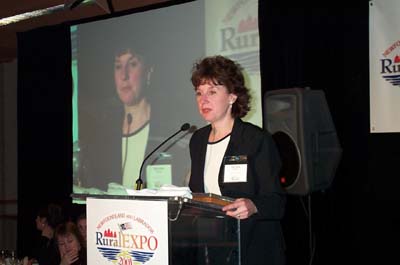 Michelle Brown addresses the audience after accepting the Award for Excellence in Partnership on behalf of the Random North Development Association. The province's first Community Economic Development Awards were presented Friday night during RuralEXPO 2001. (October 26, 2001) |