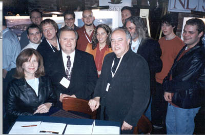 George Sweeney (centre), Parliamentary Secretary to the Minister of Industry, Trade and Rural Development for Information and Advanced Technologies; Candace Avery (left), Boston music organization NEMO; and Denis Parker (right), Music Industry Association of Newfoundland and Labrador, following the signing of a memorandum of understanding between the two organizations at a music showcase of Newfoundland and Labrador performers for Boston�s industry representatives and the general public. The music showcase took place during the province�s very first cultural industries trade mission. Representatives from Newfoundland and Labrador�s music industry witnessed the signing ceremony. (November 9, 2001) |