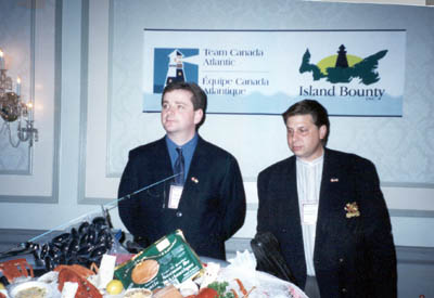 Jim Parsons (left), President, New Found Foods Inc. and a representative from Island Bounty (right), Distributor for New Found Foods Inc. promote the company�s seafood products at the Taste of Atlantic Canada food promotion event which took place during the Team Canada Atlantic trade mission to Atlanta. (November 15, 2001) |
