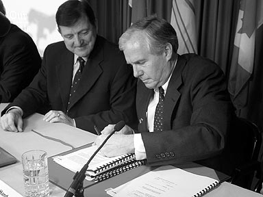 Scott Hand Chairman and CEO of Inco Ltd. (R) signing the Voisey's Bay legal agreements
