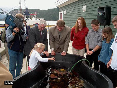 Catherine Hooper drops a specimen into a touch tank at Memorial University's newest state-of-the-art facility, the Bonne Bay Marine Station. She is assisted by (LtoR) Kelvin Parsons, provincial minister of Industry, Trade and Rural Development, Gerry Byrne, minister of state for the Atlantic Canada Opportunities Agency (ACOA), and students Diedre Puddister, Mike Kelly, Twila Goosney, and Michael Gillian. |