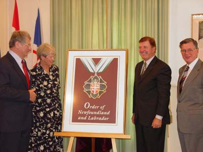 Participating in the unveiling of the Order of Newfoundland and Labrador insignia at Government House today (August 14) were His Honour Lieutenant Governor Edward Roberts, Her Honour Eve Roberts, Premier Roger Grimes and Chief Justice Clyde K. Wells. |