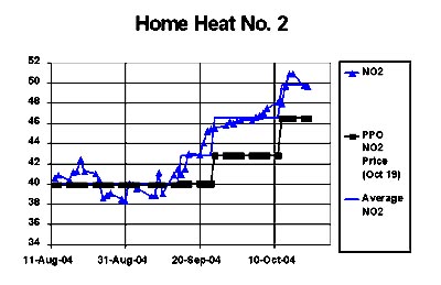 The problems associated with high oil and home heating fuel prices are not new, though worries about available distillate supplies have heightened as the draw season nears. One contributing factor is inventory stocks of distillate fuels were not significantly rebuilt during the off-peak demand season, and there are questions about whether or not it�s too late for a significant rebuild to occur before the season begins. Other reasons for the below-average inventory data include the slow recovery from storms in the Gulf of Mexico, which impaired oil production and exports; and reduced oil availability from other regions, such as the Middle East, Russia or Norway (where a strike has cut that country�s oil output). Expanding global economic activity has resulted in a growth in demand for oil to a near all-time high, which is expected to increase again next year. However, concerns have been expressed by market watchers, including U.S. Federal Reserve Chief Alan Greenspan, that persistent high oil prices will hurt world economic growth, and subsequently, prices should eventually have downward pressures. BACKGROUND The PPO uses its interruption formula whenever market prices for regulated fuels meet a certain criteria, provided making the early adjustment doesn�t interfere with the regular pricing schedule. For the interruption formula to be used on gasoline and distillate fuels, the PPO requires the average of market prices to be 3.5 cpl greater or less than the current PPO benchmark prices (except propane, which requires +/- 5.0 cpl) over five market business days. PPO benchmarks are based on the average price of refined products. Illustrated in the following graph is market-price performance of home heating fuel over recent regularly scheduled periods up to October 19, 2004: