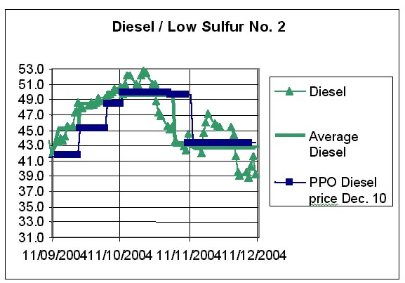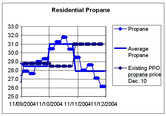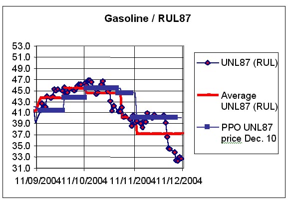 NLIS 1 December 15, 2004 (Government Services) The following is being distributed at the request of the Petroleum Pricing Office: Maximum regulated fuel prices released The Public Utilities Board�s Petroleum Pricing Office (PPO) will decrease prices for all fuels regulated in Newfoundland and Labrador (outside of areas that are currently under a price freeze). Effective 12:01 a.m. Wednesday, December 15, the maximum price for all types of gasoline will decrease by 3.3 cents per litre (cpl); diesel by 0.7 cpl; No. 2 blend furnace oil by 1.14 cpl; and stove oil by 1.17 cpl. Residential propane used for home heating purposes will see a price drop of 3.1 cpl. These are the maximum prices, and retailers and wholesalers can sell below the maximum at any time. The past 30-day pricing period for refined fuels on the world market has been anything but ordinary. The beginning of the session demonstrated high prices for refined petroleum products that, when averaged with the recent declines on the world market in the past week or so, resulted in an overall lowering of regulated prices. David Toms, PPO director (acting), said there may be expectations from the public that there would be larger decreases in prices at this time given the dramatic drops in the crude oil market during the latter part of this period. He explained that regulated prices are not based directly on crude oil performance, but on the market prices for finished or refined products, specifically for gasoline and distillate fuels (home heat and diesel) from the New York Mercantile Exchange (NYMEX), as well as propane. The movement of crude oil prices is not directly proportional to the prices of finished products, which must take into account such factors as refining capacity, level of inventories, and seasonal dependencies. "In accordance with Section 14 of the regulations for the Petroleum Products Act, regulated pricing takes into account the period from when prices were last changed � in this case, from November 12 to December 10 - and not just isolated events," he noted. "Since we last set prices November 15, commodity prices, with the exception of propane, started moving below the PPO benchmarks only in the last part of this regulation timeframe. The interruption formula criteria were not met before the cut-off point." Mr. Toms emphasized that should market prices move such that the criteria for the interruption formula are met, the PPO will act accordingly and decrease maximum prices, just as it would do if there were an increase. "This formula is used in an objective, consistent and fair manner for price increases and decreases," said Mr Toms. MARKET MOVERS Since the PPO last set maximum fuel prices November 15, there was some upward pressure on prices that resulted from the concern that available oil supplies wouldn�t compensate for the ongoing disruptions to the market from some of the world�s major oil producers. Specific examples include: Norway, where production was cut because of a gas leak; Nigeria, where militants stormed pumping stations and halted output; and the Middle East, where attacks continued to threaten oil production. Also placing pressure on fuel prices were the slow recovery of crude oil on the market, as well as the lower-than-average supplies of distillate fuels (home heating fuel and diesel) in advance of the onset of winter. Inventories for petroleum products have also rebounded. Many refineries that were shut down for routine maintenance have returned to normal operations and production rates are at high levels � reportedly the most since Hurricane Ivan forced shutdowns in September. A key factor in helping to replenish distillate inventories was the relatively mild weather in the Atlantic region and along the northern eastern U.S. (the largest area of home heating oil consumption). As a result, recent demands for these products were less than anticipated. When looking at other products regulated by the PPO, gasoline supplies have risen to levels not seen since August and inventory builds for propane have been strong. This activity has assisted in lowering the price for these products at this time. Internationally, OPEC (Organization of Petroleum Exporting Countries) members have been pumping the most oil in 25 years in order to meet a thriving demand. This has secured traders� concerns about available supplies on the market. However, at its December 10 meeting in Cairo, OPEC decided to cut one million barrels of surplus production per day because members believe the market to be well supplied and they wanted to avoid an "extraordinary build-up of inventory levels" (Reuters, December 10, 2004). BACKGROUNDER PPO benchmarks are based on the average price of refined products. Illustrated in the following four graphs are the market-price performances of the four products regulated by the PPO, for recent regularly scheduled periods up to December 10, 2004: