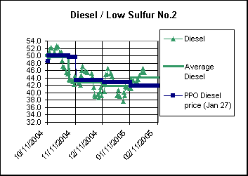 NLIS 9 January 31, 2005 (Government Services) The following is being distributed at the request of the Petroleum Pricing Office: Petroleum Pricing Office makes early adjustment to maximum diesel prices Recent pressure on world fuel markets has led the Public Utilities Board�s Petroleum Pricing Office (PPO) to make another price adjustment for a regulated fuel in Newfoundland and Labrador (NL). The PPO interruption formula criteria were met for diesel, and it means an increase of 2.5 cents per litre (cpl) to the maximum allowable price as of 12:01 a.m. Monday, Jan. 31, except in areas where a price freeze is in effect. This change falls in line with the recent elevated pricing activity on the commodities markets that also caused NL market-price interventions for No. 2 furnace oil (Jan. 25), gasoline (Jan. 29) and stove oil (Jan. 30) in this province. David Toms, PPO director (acting), explained that this is clearly a period of extreme volatility for world fuel prices. He added that it was expected that diesel prices would change shortly after furnace and stove oil because these products are similar in nature and they face many of the same pricing pressures. One of the main factors driving prices upward for distillate fuels would be the reported decrease in inventories, as a result of the colder-than-average weather that caused a strain on existing supplies. Other reasons that all market prices for fuels regulated in this province were kept at high levels were: concerns about future fuel supplies leading up to the OPEC (Organization of Petroleum Exporting Countries) meeting Jan. 30 where production quotas were to be discussed; the period leading up to the Iraqi election, where potential unrest was thought to be a possible threat to the country�s oil network; increasing global demand, particularly in China; and, ongoing uncertainty about fuel supplies from major oil-producing countries, such as Nigeria and Iraq. BACKGROUNDER PPO benchmarks are established based on the average prices of refined products in the period since the last time maximum prices were established. For the interruption formula to be used on gasoline and distillate fuels, the PPO requires the average of market prices to be 3.5 cpl greater or less than the current PPO benchmark prices (except propane, which requires +/- 5.0 cpl) over five market business days. As well, the interruption formula will only be used five days after the last pricing adjustment and as long as making the change doesn�t interfere with the regular pricing schedule. Illustrated in the following graph is the market-price performance of diesel regulated by the PPO for recent pricing periods up to Jan. 27, 2005: