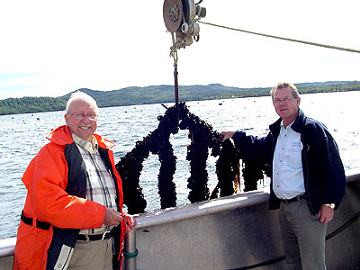 Minister Rideout and Job Halfyard at mussel site in Woodford's Arm. |