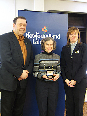 Education Minister Joan Burke and Transportation and Works Minister John Hickey congratulate Council of the Federation Literacy Award winner, Evelyn Keener. |