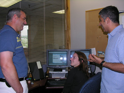 Emad Rizkalla, president of Bluedrop Performance Learning (right) and Kimberley Puddester, multimedia developer (centre), discuss Bluedrop's products and services with the Honourable Trevor Taylor, Minister of Innovation, Trade and Rural Development. |