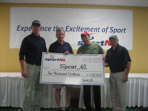 Cheque Presentation following Sport Newfoundland and Labrador�s First Annual Golf Tournament. Left to Right: Troy Croft � Executive Director SportNL, Tom Godden, President SportNL, Corey Gregory, Key Account Manager Coca Cola Bottling, Rod Nichol, First Vice President SportNL |