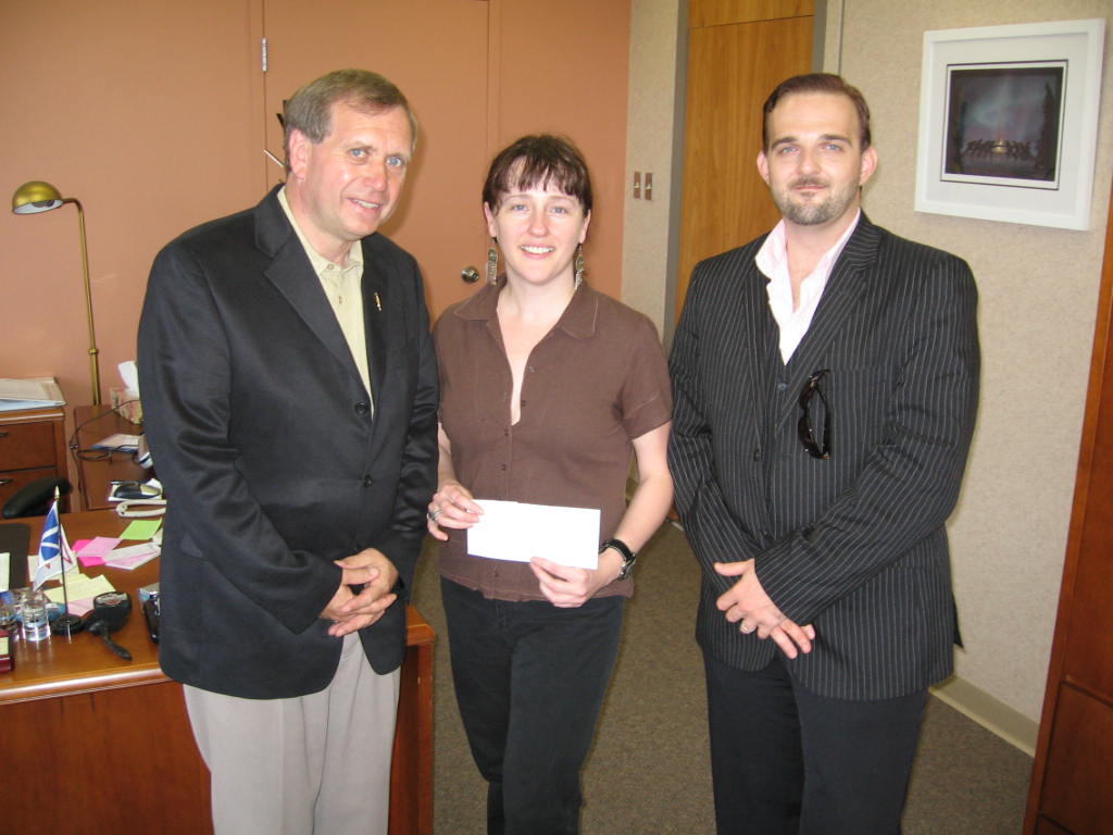 The Honourable Tom Hedderson, Minister of Tourism, Culture and Recreation, presents a cheque for $40,000 to Film Producers Association of Newfoundland President Lynne Wilson and International Marketing Director Frank Fagan. |