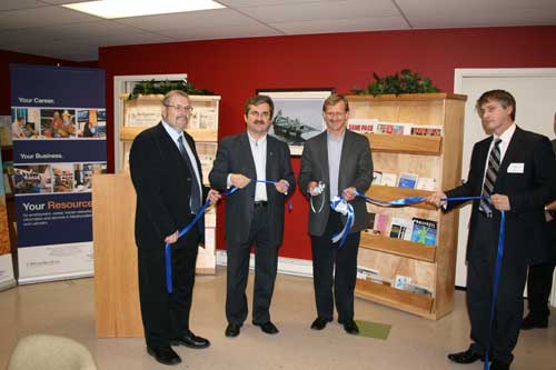 The Honourable Shawn Skinner, Minister of Human Resources, Labour and Employment, second from left, is joined by the Honourable Jerome Kennedy, MHA for the District of Carbonear � Harbour Grace, second from right, and Calvin Peach, MHA for the District of Bellevue, left, to cut the ribbon to officially open the Carbonear Career Work Centre. At right is John Kennedy, an employee of the Department of Human Resources, Labour and Employment. |