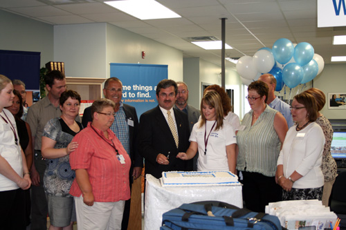 The Honourable Shawn Skinner, Minister of Human Resources, Labour and Employment, centre, is joined by (from L to R) Jennifer Brown, Donna McDonald, David Sweet, Darren Finn, Nadine Hale, Patsy Frampton, Carson Saunders, Eugene Hickey, Carla Saunders, Ellen Foley, Stephanie Greene, Leon House (behind Stephanie), Christa Skinner, Cynthia Hennessey-Lewis to cut the cake at the official opening of the Grand Falls-Windsor Career Work Centre. |