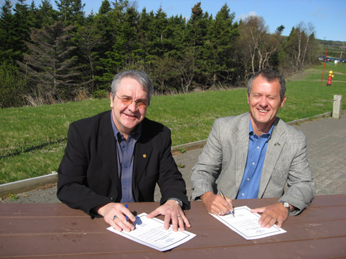 The Honourable Clyde Jackman, Minister of Tourism, Culture and Recreation, and Bruce Sparkes, President of Hospitality Newfoundland and Labrador (HNL), sign a proclamation to officially declare June 2-8 as Tourism Awareness Week in Newfoundland and Labrador. |