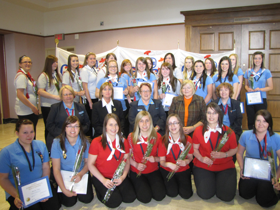 Photo: Twenty-nine members of the provincial chapter of the Girl Guides of Canada-Guides du Canada received the highest award in Guiding on May 26 during a ceremony at the Confederation Building. Participating in the event were (centre row, left to right): Deputy Provincial Commissioner Rosalind Pratt; the Honourable Joan Burke, Minister of Child, Youth and Family Services; Deputy Chief Commissioner Sharron Callahan; the Honourable Dianne Whalen, Minister of Municipal Affairs and Deputy Provincial Commissioner Germaine Fisher.