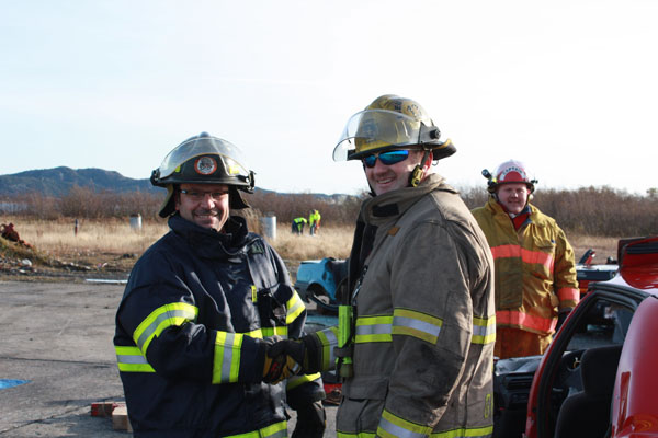 MHA Tony Cornect and FES-NL Regional Trainer and Fire Lieutenant Kent Abbott after a vehicle extrication demonstration in Stephenville
