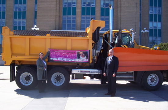 Photo: The Honourable Trevor Taylor, Minister of Transportation and Works today unveiled the Provincial Government's first snowplow sideguard. Minister Taylor was joined by Jeannette Holman-Price, Director of the Jessica Campaign.