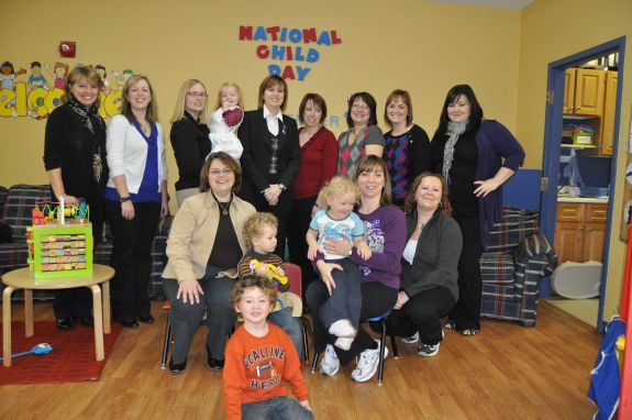 The Honourable Joan Burke, Minister of Child, Youth and Family Services (CYFS) meets with Family and Child Care Connections (FCCC) representatives and children to celebrate National Child Day. Front Row: Nicholas Blundon. Middle Row: (Left to Right) Kim Samara, Family Child Care Provider; Jack Sullivan; Cheryl Stacey Barrett, Family Child Care Provider; Grace Mootrey; Bernice Morgan, Early Childhood Educator and Playgroup Facilitator. Back Row: Lynn Smyth, Coordinator, FCCC; Jennifer Russell, Inclusion Consultant, CYFS; Skye Taylor, Director of Professional Development, Association of Early Childhood Educators Newfoundland and Labrador; Anna Taylor; Minister Burke; Mary Linehan, Early Childhood Educator; Valerie Collins, Home Visitor; Trudy Cuza, Home Visitor; Eilis Baker, Administrative Assistant, FCCC.