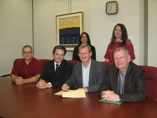 Proclamation signing during 2010 Mental Illness Awareness Week. Back row (left to right): Gloria Williams, Mental Health Promotion Consultant, Eastern Health; Paula Corcoran, Peer Support Coordinator, CHANNAL. Front row (left to right): Dave Banko, Executive Director, Schizophrenia Society of Newfoundland and Labrador; Mark Gruchy, President, Canadian Mental Health Association Newfoundland and Labrador (CMHA-NL); the Honourable Jerome Kennedy, Minister of Health and Community Services; George Skinner, Executive Director, CMHA-NL.