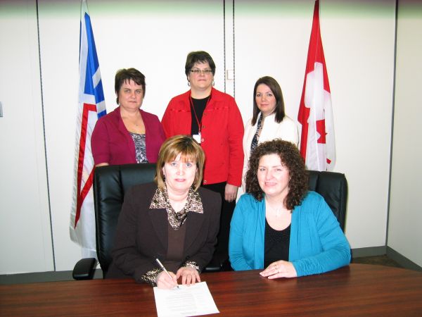 The Honourable Joan Burke, Minister of Education, signs the proclamation declaring February Inclusive Education Month. Pictured are: Front Row (L to R): Minister Burke; Sherry Gambin-Walsh, Community Inclusion Coordinator, Newfoundland and Labrador Association for Community Living (NLACL). Back Row (L to R): Darlene Nash, Business Manager, NLACL; Sharon Whalen, Department of Education; Jackie-Fewer-Bennett, Department of Education.