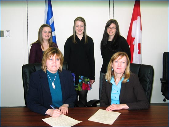 The Honourable Joan Burke, Minister of Education joins Yvonne Dawe, Chair of the Eastern Newfoundland Science Fairs Council, to proclaim March as Science Month in Newfoundland and Labrador schools. From back left are: Lauren Rolling and Caroline Molloy, Grade 12 students at Bishops College High, and Erin Baker, a 2nd year math and physics student at Memorial University, all of whom are former gold-medal winners at the Eastern Newfoundland Science and Technology Fair.