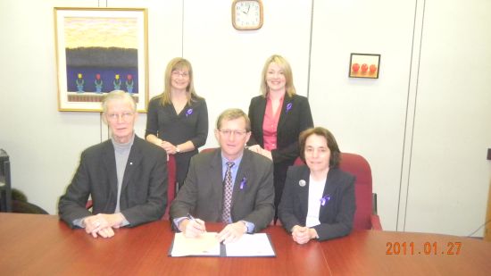 Photo: The Honourable Jerome Kennedy, Minister of Health and Community Services, signs the Eating Disorder Awareness Week proclamation. Front row (left to right): Vince Withers, Chair, Eating Disorder Foundation of Newfoundland and Labrador (EDFNL); Minister Kennedy; and, Dr. Olga Heath, Assistant Professor, Memorial University and EDFNL Board Member. Back row (left to right): Krista Wade, Manager, Centre for Hope, Eastern Health; and, Ellen Foley, Executive Director, EDFNL.