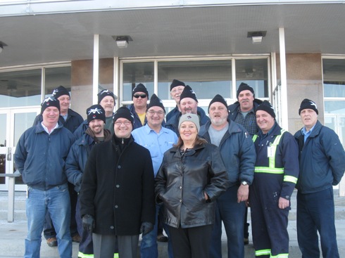 Photo 1: The Honourable Darin King, Minister of Human Resources, Labour and Employment and Minister Responsible for the Newfoundland and Labrador Housing Corporation, joined by Kimberly Yetman-Dawson, Network Director, Newfoundland and Labrador Housing and Homelessness Network and outside workers from Newfoundland Labrador Housing, wearing Raise the Roof toques in support of the campaign to reduce homelessness.