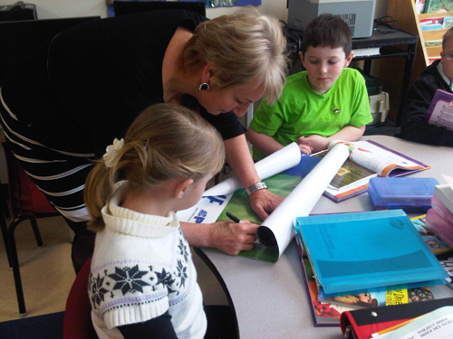 Premier Kathy Dunderdale signs a poster for students at the official opening of Copper Ridge Academy in Baie Verte.