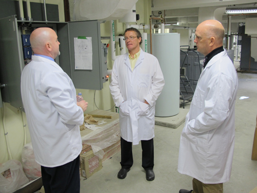 The Honourable Derrick Dalley, Minister of Fisheries and Aquaculture, announced today details of a $5 million investment in Gray Aqua Group Ltd. to expand salmon farming efforts in the Coast of Bays region. L-R: Dr. Daryl Whelan, Director of Aquatic Animal Health, Minister Dalley, and Tim Gray, President of Gray Aqua Group Ltd., touring the province's Centre for Aquatic Health and Development – November 6, 2012