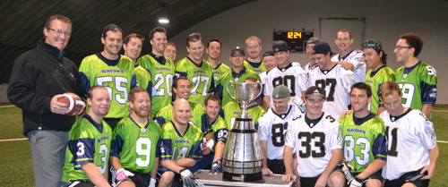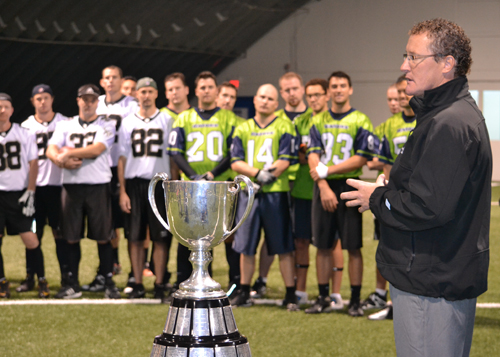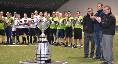 The Honourable Derrick Dalley, Minister of Tourism, Culture and Recreation welcomed the Grey Cup to Newfoundland and Labrador at a touch football game played at the Team Gushue Sports Complex in Mount Pearl. Monday, October 8, 2012