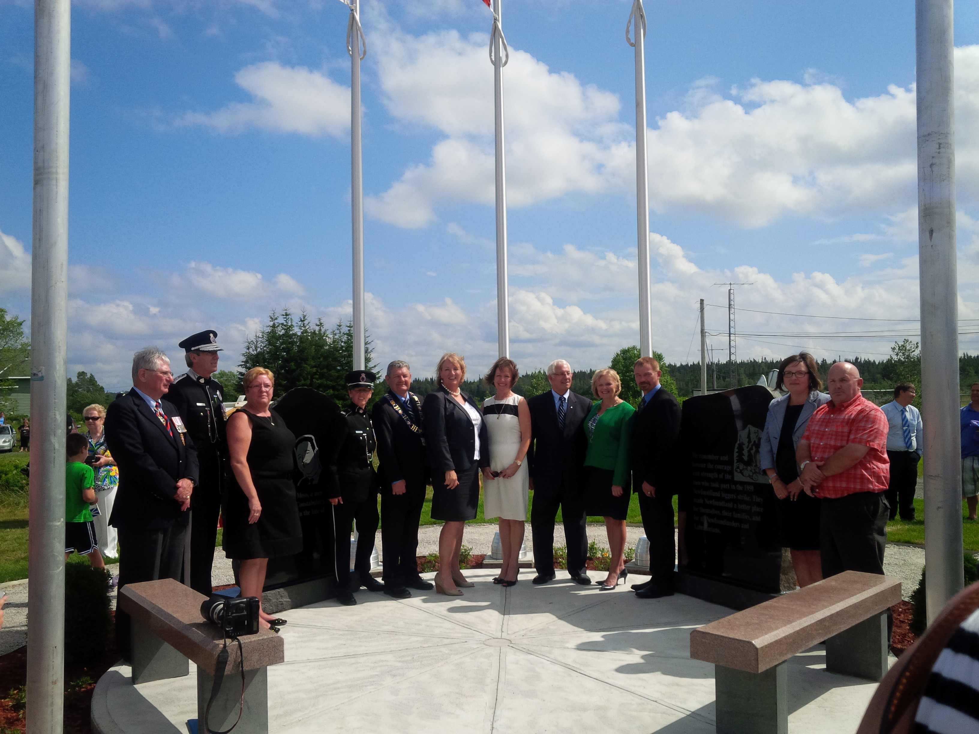 Premier Dunderdale participates in the unveiling of a new monument in Badger honouring Constable William Moss as well as the commitment to improving labour conditions and relationships – July 31, 2013.