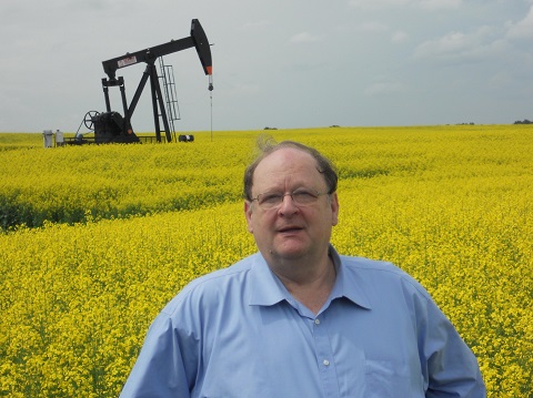 The Honourable Tom Marshall, Minister of Natural Resources, stands in a canola field with a pumpjack producing oil at a well in southeast Saskatchewan. The process of hydraulic fracturing has been used there for decades to extract oil from shale rock formations underground.
