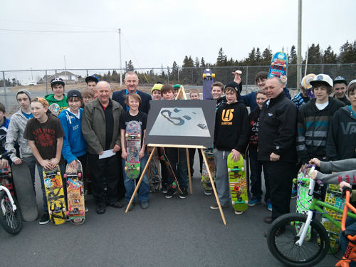 The Honourable Terry French, Minister of Tourism, Culture and Recreation is joined by Glenn Littlejohn MHA for Port de Grave, Bay Roberts Deputy Mayor Bill Seymour and young residents of the town for the new skate park funding announcement April 10, 2013.