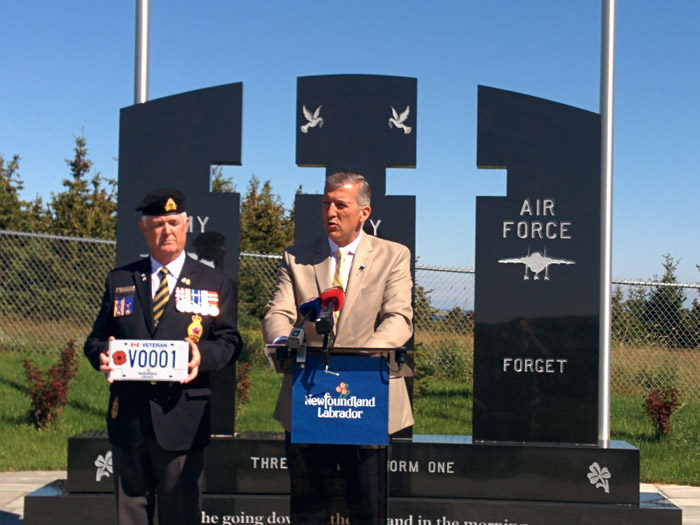 A new provincial licence plate for veterans was officially unveiled today at the Royal Canadian Legion War Memorial in Logy Bay-Middle Cove-Outer Cove. The Honourable Paul Davis, Premier of Newfoundland and Labrador, presented the first of these new licence plates to Frank Sullivan, a veteran and First Vice-President of the Newfoundland and Labrador Provincial Command of the Royal Canadian Legion. They were joined by the Honourable Dan Crummell, Minister of Service NL, and Provincial Command President Comrade Ross Petten.